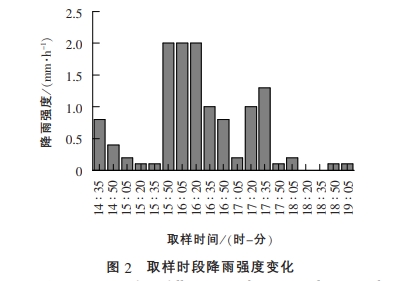 重點監(jiān)測降雨期雨污合流污水水質(zhì)變化,分別在5處主要箱涵新建截流井處設(shè)置取樣點位,從降雨起始階段開始取樣直至降雨結(jié)束,取樣間隔時間為 15 min,通過雨量計記錄降雨強度,如圖2所示分別在工業(yè)園區(qū)、硬化路面、草地、商業(yè)街選擇代表性地塊,在降雨期進行地表徑流取樣,取樣間隔時間為 15 min[s-6]