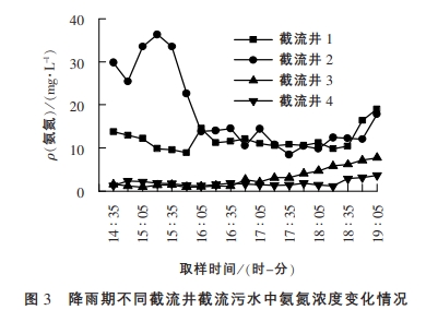 受納水體十五里河水質(zhì)重點污染因子為氨氮因此重點監(jiān)測氨氮濃度,3 污染特征及調(diào)控策略3.1截流式合流制污水特征通過降雨期不同截流井截流污水中氨氮隨降雨歷時的變化規(guī)律發(fā)現(xiàn)(圖3),