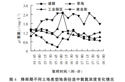 通過降雨期不同土地類型地表徑流的氨氮濃度監(jiān)測結(jié)果發(fā)現(xiàn)(圖4),該研究區(qū)域地表徑流產(chǎn)生的氨氮質(zhì)量濃度一般小于 2.5 mg/。由此可見,該區(qū)域合流制管網(wǎng)中地表徑流污染對于氨氮的貢獻值較小,不同截流井間濃度差別較大的原因主要是由管網(wǎng)系統(tǒng)原早季污水水質(zhì)水量的差別