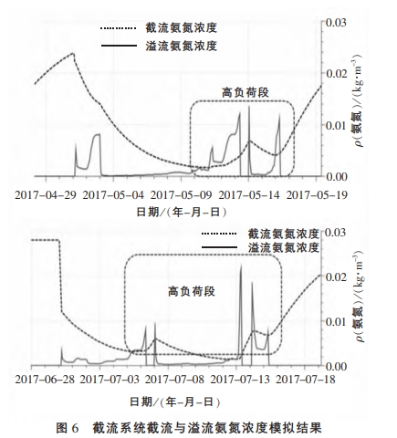 (1)原截流系統(tǒng)截流污水氨氮濃度模擬。針對全年降雨情境,模擬截流調(diào)蓄系統(tǒng)全年降雨期截流調(diào)蓄特征。截流系統(tǒng)截流與溢流氨氮濃度模擬結(jié)果見圖6。由圖6可知,2場典型降雨場次模擬中, 降雨起始時,較高濃度的合流污水被截流至調(diào)蓄池中,隨著降雨持續(xù),入調(diào)蓄池截流污水濃度逐漸降低,并發(fā)生截流井溢流,在降雨后期,溢流濃度呈現(xiàn)增長趨勢,受調(diào)蓄池調(diào)蓄能力影響,溢流濃度要高于調(diào)蓄池濃度