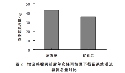 (2)各截流井處增設(shè)鴨嘴閥前后截流效果對比。對比各截流井處增設(shè)鴨嘴閥后對整個截流調(diào)蓄系統(tǒng)降雨期截流效果的影響。單次降雨情境下增設(shè)鴨嘴閥后各截流井溢流氨氮負荷量如圖7所示,增設(shè)鴨嘴閥后前后單次降雨情境下截流系統(tǒng)溢流氨氮總量對比如圖8所示;