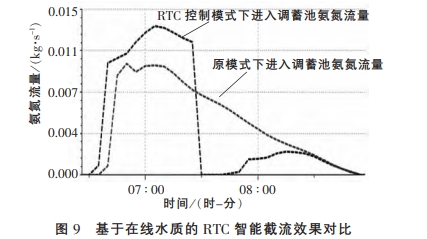 由圖7、圖8可知,增設(shè)鴨嘴閥后,當(dāng)調(diào)蓄池?zé)o調(diào)蓄空間時,各截流井分別溢流,單次降雨情境下溢流氨氮總量為 35.681kg。而未增設(shè)鴨嘴閥時單次降雨情境下,主要從截流井3處發(fā)生溢流,造成主截流管道的混合污水溢流,總溢流氨氮量為43.092kg。通過截流系統(tǒng)的優(yōu)化,能夠使單次降雨情境下,溢流污水氨氮總量削減 17.2%。(3)基于在線水質(zhì)反饋的 RTC 智能截流效果模擬結(jié)果。結(jié)合降雨期溢流污水氨氮變化特征呈現(xiàn)先降后升的特點,且各截流井溢流污水濃度存在差異,通過調(diào)蓄池前段設(shè)置電動閘門,并在截污井1處設(shè)置在線氨氮儀表,模擬合流制污水 RTC智能截流的效果,截流效果對比如圖9所示由圖9可知,采用RTC控制時,能夠提升降雨期合流污水氨氮的截流總量,運行后效果較原工況提高氨氮削減量 7.5%。