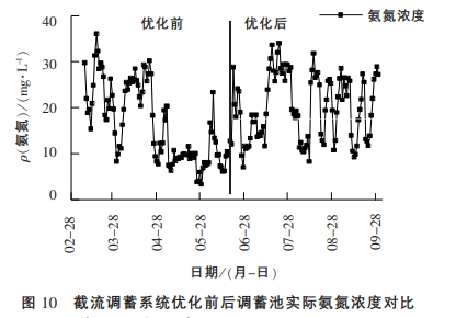 在模擬論證基礎(chǔ)上,截流井截流管段增設(shè)了鴨嘴閥,并在截流井1、2設(shè)置在線儀表,對現(xiàn)有系統(tǒng)實施了智能截流調(diào)控措施。通過對實施前后調(diào)蓄工程中調(diào)蓄池水質(zhì)監(jiān)測結(jié)果對比(見圖10),截流系統(tǒng)優(yōu)化后,截流至調(diào)蓄池的氨氮濃度有所提高氨氮日均質(zhì)量濃度由 16.4 mg/L 提升至 19.7 mgL,有效提升了降雨期截流調(diào)蓄工程對于合流制污水的污染物削減量,進一步改善了受納水體水質(zhì),