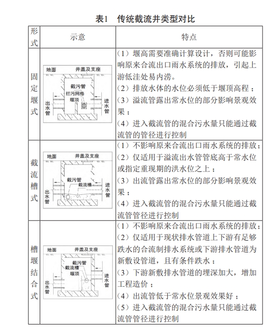傳統(tǒng)截流井可以直接在現(xiàn)狀排水口進(jìn)行改造,且不需要設(shè)備,造價(jià)低,運(yùn)行管理方便,在一定時(shí)期內(nèi)得到了廣泛推廣。但其也存在不少弊端,主要如下:①降雨初期通過(guò)截流管進(jìn)入污水系統(tǒng)的混合污水量和水質(zhì)都不穩(wěn)定,污水量增大且含有大量無(wú)機(jī)物,不利于污水處理廠的運(yùn)行:②截流管管口的格柵很容易被雜物堵塞,造成污水溢流,對(duì)水體造成一定程度的污染:③中、大雨期間,管涵內(nèi)以雨水為主,導(dǎo)致進(jìn)入截流管道的污水濃度偏低,嚴(yán)重影響污水處理廠處理效果:④下游受納水體水位的標(biāo)高一旦超過(guò)溢流口的底標(biāo)高便會(huì)倒灌,導(dǎo)致進(jìn)入污水處理廠的污水量增加,增加污水處理廠負(fù)擔(dān),甚至影響其運(yùn)行:⑤采用堰式截流井的堰頂高程如高于當(dāng)前合流排水管涵的底高程,還可能造成上游低洼區(qū)域積水而引發(fā)內(nèi)澇。不同類型的傳統(tǒng)截流井特點(diǎn)詳見(jiàn)表1。