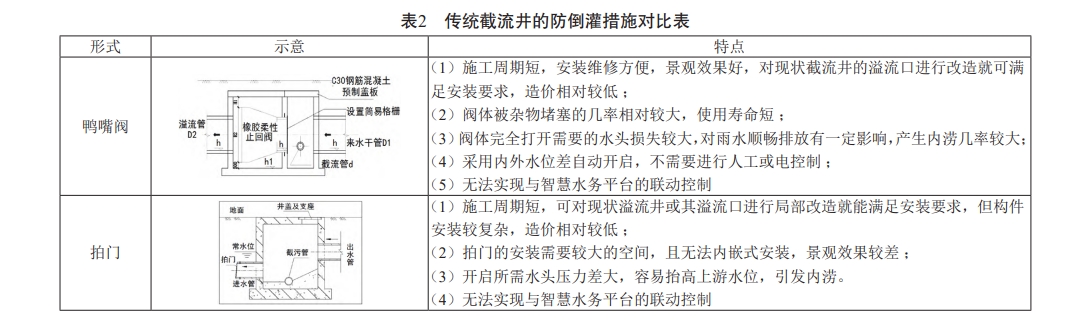 鴨嘴閥和拍門(mén)是傳統(tǒng)截流井常用的防倒灌設(shè)備但其打開(kāi)需要一定的水頭損失,密閉性能不好,也無(wú)法通過(guò)水位或水質(zhì)控制設(shè)備的自動(dòng)啟閉,存在一定的風(fēng)險(xiǎn)。鴨嘴閥還存在易被雜質(zhì)堵塞、使用壽命短的問(wèn)題,裝在沿海城市排海口上的拍門(mén)還會(huì)因海蠣等生物附著生長(zhǎng)而失效。