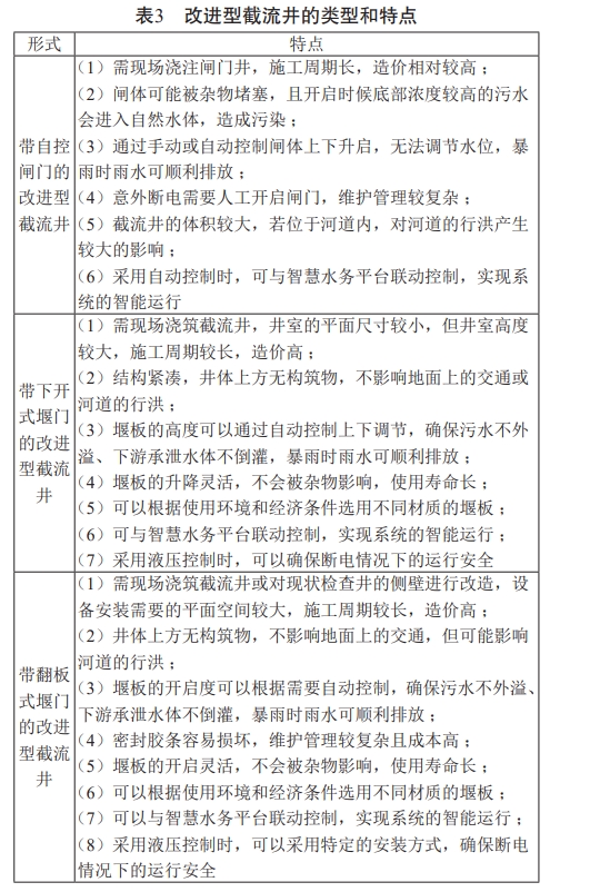 傳統(tǒng)截流井的防倒灌措施優(yōu)缺點(diǎn)詳見(jiàn)表2.3 改進(jìn)型截流井的特點(diǎn)和工作原理3.1改進(jìn)型截流井的類型和特點(diǎn)改進(jìn)型截流井通過(guò)增加可靠的技術(shù)措施和必要的設(shè)備針對(duì)性解決傳統(tǒng)截流并存在的問(wèn)題。首先是增大截流管,并在截流管口增設(shè)限流閘門(mén),根據(jù)截流井內(nèi)的水質(zhì)、水深控制開(kāi)啟度,甚至在大暴雨期間完全關(guān)閉,用于控制進(jìn)入污水廠的水質(zhì)和水量,并有效避免截流管被堵:浮渣擋板將水中的漂浮物攔截,不會(huì)進(jìn)入下游承泄水體:自控閘門(mén)、液動(dòng)下開(kāi)式堰門(mén)和液動(dòng)翻板式堰門(mén)除了可以防止污水溢流污染水體,還可以根據(jù)截流井內(nèi)和下游水體的水位實(shí)現(xiàn)自動(dòng)控制:液動(dòng)下開(kāi)式堰門(mén)和液動(dòng)翻板式堰門(mén)還能根據(jù)上游的內(nèi)澇要求和下游河道的水位自動(dòng)調(diào)節(jié)高度,事故斷電也可以自動(dòng)確保現(xiàn)狀合流管渠的行洪安全。改進(jìn)型截流井的類型和特點(diǎn)詳見(jiàn)表3。