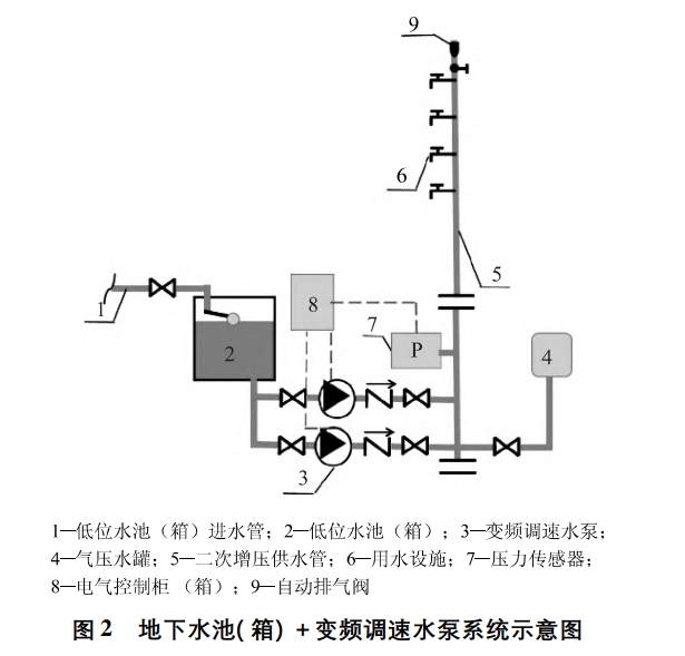 (3)保障消防系統(tǒng)。對(duì)于生活消防合用的供水系統(tǒng),為避免影響消防系統(tǒng)的正常運(yùn)行,應(yīng)盡量避免改造中牽動(dòng)消防系統(tǒng)。水池生活消防合用時(shí),若泵房空間充足,優(yōu)先考慮單獨(dú)設(shè)置生活水箱,反之優(yōu)先考慮疊壓供水方式;水泵生活消防合用時(shí),優(yōu)先考慮重新設(shè)置生活水泵,將原水泵留作消防用。2.2 地下水池( 箱)+ 變頻調(diào)速水泵供水由水泵從地下水池(箱)取水,通過變頻器改變供電頻率控制水泵電機(jī)轉(zhuǎn)速,使水泵轉(zhuǎn)速和流量可調(diào)節(jié),由水泵、控制柜(含變頻器)、壓力檢測(cè)儀表、管路、閥門等組成,如圖2所示