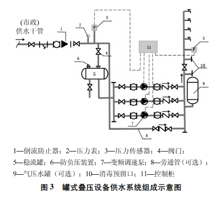管道直聯(lián)疊壓供水技術(shù)繼水箱、工頻水泵、變頻調(diào)速水泵后發(fā)展的直接串接到市政給水管網(wǎng)的引入管或有壓管道上加壓的新型給水設(shè)備,可充分利用市政供水管網(wǎng)的壓力,減少水泵揚(yáng)程,節(jié)省電耗;省去地下水池(箱)、吸水井等構(gòu)筑物,節(jié)省投資,簡(jiǎn)化系統(tǒng)“;可防止水在地下水池(箱)等構(gòu)筑物中的二次污染和可能的溢流水損失,方便管理維護(hù),便于水泵自動(dòng)控制。其中罐式疊壓供水采用穩(wěn)流補(bǔ)償器(壓力罐)做調(diào)蓄設(shè)施的疊壓供水設(shè)備,主要由穩(wěn)流罐、變頻調(diào)速泵組、氣壓水罐、變頻控制柜、管道、閥門及儀表等組成,基本組成如圖3 所示。