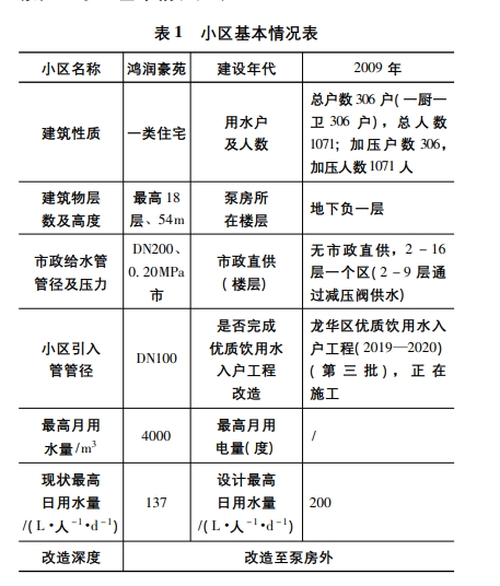 3.1 小區(qū)泵房情況評(píng)估本次給水改造各個(gè)小區(qū)分散各自獨(dú)立,各小區(qū)設(shè)計(jì)范圍較小,采用居民生活用水定額預(yù)測(cè)方法進(jìn)行計(jì)算網(wǎng),本設(shè)計(jì)案例小區(qū)為龍崗區(qū)樟富南路鴻潤(rùn)豪苑,小區(qū)基本情況見表1。