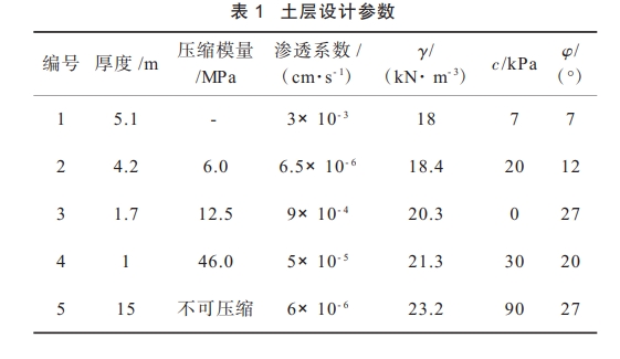 場地的工程地質(zhì)條件和基坑圍護(hù)設(shè)計(jì)參數(shù)見表1(分為五個(gè)土層:1 素填土,2粉質(zhì)黏土,3 粉砂,4 強(qiáng)風(fēng)化泥質(zhì)粉砂巖,5 中風(fēng)化泥質(zhì)粉砂巖)。