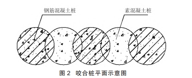 咬合樁具有防滲能力強(qiáng)、造價(jià)低、無需泥漿護(hù)壁、施工速度快、成樁質(zhì)量高等優(yōu)點(diǎn),且適用于多種地質(zhì)條件。鋼筋混凝土樁與素混凝土樁切割咬合樁與樁之間排列構(gòu)成相互之間互相咬合的樁墻,此種結(jié)構(gòu)即為咬合樁。為便于切割,樁的排列方式一般為一根素混凝土樁和一根鋼筋混凝土樁。素混凝土樁采用超緩凝混凝土(初凝時(shí)間為60h),要求必須在素混凝土樁初凝之前完成對(duì)素混凝土樁的全部切削。鋼筋混凝土樁施工時(shí)采用全套管鉆機(jī)切割相鄰素混凝土樁相交部分的混凝土,實(shí)現(xiàn)咬合。咬合樁施工采用全套管+旋挖鉆機(jī),施工流程為平整場地→測設(shè)樁位→施工咬合樁導(dǎo)墻→套管鉆機(jī)就位對(duì)中一吊安第一節(jié)套管→控測垂直度→壓人第一節(jié)套管→校核垂直度→抓斗取土,套管鉆進(jìn)→孔深測量→清除虛土,檢查孔底→鋼筋混凝土樁吊放鋼筋籠→放人混凝土灌注導(dǎo)管→灌注混凝土逐次拔管→測定樁頂混凝土面→套管鉆機(jī)移位。咬合樁構(gòu)造如圖2所示。