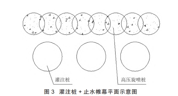灌注樁支護(hù)體系適用于各種地質(zhì)條件下的深基坑工程,具有剛度大、變形小、技術(shù)成熟、施工速度快等優(yōu)點(diǎn)。當(dāng)需要隔地下水時(shí),需要另行設(shè)置隔水帷幕。考慮到場地內(nèi)的孔隙潛水,在灌注樁外側(cè)設(shè)高壓旋噴樁止水帷幕。灌注樁+止水帷幕構(gòu)造如圖3 所示。