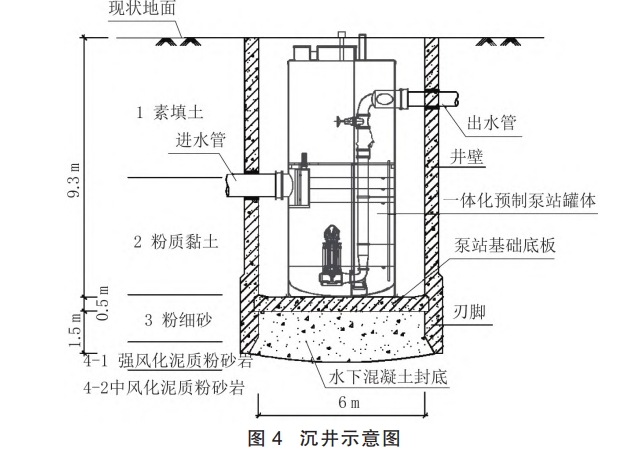 沉井是一種在地面制作后,在井內(nèi)挖土并依靠自身重量克服井壁與土的摩擦力下沉至設(shè)計(jì)標(biāo)高的結(jié)構(gòu),常用于工業(yè)建筑中的構(gòu)筑物、橋梁基礎(chǔ)、臨時(shí)基坑支護(hù)等領(lǐng)域4。在市政工程中,鋼筋混凝土主要用于頂管工程中的工作井、接收井等。沉井下沉深度較大,整體性強(qiáng)、穩(wěn)定性好,可以承受較大的豎向和水平荷載,施工技術(shù)簡單,自身具有擋土和擋水的功能,適用范圍廣,且造價(jià)不高。但沉井需分節(jié)制作,分節(jié)下沉,每節(jié)高度一般不超過6m。沉井的施工順序一般為地基處理一制作第一節(jié)沉井→抽墊木、挖土下沉→沉井接高下沉→封底。沉井混凝土強(qiáng)度達(dá)到設(shè)計(jì)強(qiáng)度的 75%以上時(shí)才能下沉,單節(jié)沉井施工周期約 20~25 d。本工程地下水豐富,沉井下沉深度范圍內(nèi)透水層強(qiáng)的粉砂層,可采用不排水法下沉施工,即沉井帶水下沉至設(shè)計(jì)高程后,采用一定厚度的水下混凝土進(jìn)行封底。待水下封底混凝土強(qiáng)度等級(jí)達(dá)到設(shè)計(jì)要求后再將井內(nèi)水抽除。水下封底前須有潛水員潛入水下檢查井底是否開挖到位,按設(shè)計(jì)要求整平基底,并將刃腳混凝土面上的泥土沖洗干凈,以確保水下混凝土有足夠的斷面抵抗地下水的上浮力。沉井如圖 4所示