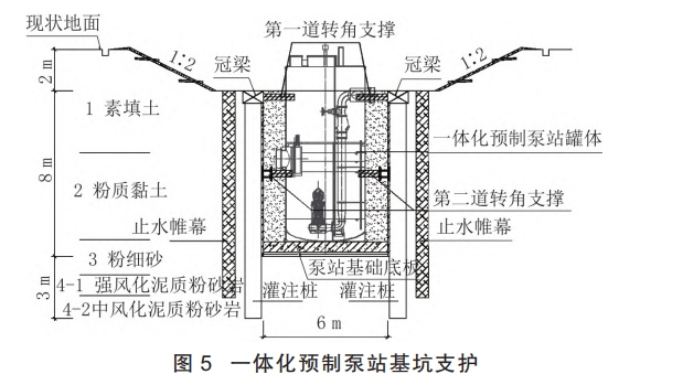 基坑支護(hù)結(jié)構(gòu)按二維平面結(jié)構(gòu)簡化分析,取單位長度按彈性地基梁進(jìn)行計(jì)算,土壓力按朗肯土壓力理論分層計(jì)算,計(jì)算采用天漢軟件。經(jīng)過計(jì)算分析,一體化預(yù)制泵站基坑支護(hù)采用頂部放坡+灌注樁支護(hù)的形式,頂部放坡高度2m,放坡坡比1:2.坡面采用 0.08m厚掛網(wǎng)噴砼護(hù)面,坡底與灌注樁之間設(shè) 1.5 m 寬平臺(tái),灌注樁徑 0.8 m,樁中心距 1.2 m,樁長 13 m,樁頂高程以下 0.3 m處設(shè)一道鋼筋混凝土角撐。灌注樁外側(cè)設(shè)直徑 0.6 m、間距 0.45 m的高壓旋噴樁止水帷幕,旋噴樁樁長10m,樁之間咬合0.15 m。樁身最大彎矩設(shè)計(jì)值為 448 kN·m,樁身最大水平位移為 11 mm,小于 60 mm,滿足二級(jí)基坑變形要求,被動(dòng)區(qū)抗力系數(shù)大于1.05,抗隆起安全系數(shù)大于 1.8,均滿足要求。基坑支護(hù)如圖5 所示。