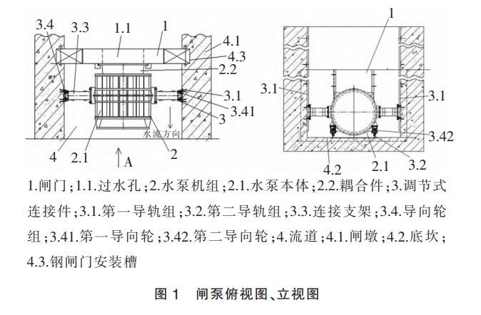 為解決傳統排澇泵站存在的諸多問題,在閘泵一體化設計基礎上創新性地提出了泵站閘泵分離及水下盲裝耦合技術,采用“閘門”+“潛水電泵”的閘泵分離技術,相比于閘泵一體化泵站,安裝及維護工藝簡單,并解決了閘泵一體化泵站設備升降安裝困難等問題閘泵分離是閘門及潛水電泵分開獨立布置的技術。閘門與設置在流道側壁上的安裝槽相匹配設置,且閘門上設有用于水流通過的過水孔,潛水電泵通過調節式連接件設置在閘門的一側,潛水電泵包括水泵本體以及設置在水泵本體上與過水孔相匹配的耦合件,耦合件能使經過水孔來的流水由水泵本體排出。在水泵周圍設置了兩條導軌組,能夠實現水泵機組沿流道垂直方向和水平方向的雙重位置精準調節,確保水泵與閘門密封耦合,操作簡單,能有效實現排洪。水下盲裝耦合技術利用水泵導向桿與閘門導入槽正常耦合,耦合法蘭與閘門耦合密封,此時導向桿與導向槽是有距離的,在潛水電泵啟動時,利用水泵本體反推力的作用,水泵向鋼閘門側移動,達到自動密封的條件從而正常排澇。閘泵密封耦合時,其閘門導向槽及底座混凝土與軌道的組合大大增加了水泵運行的強度、剛度、穩定性。見圖1。