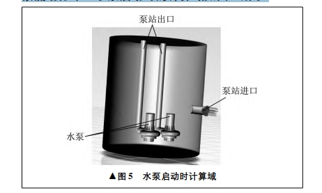 采用 ANSYS CFX 流體分析及仿真軟件對一體化預制泵站內部流動進行計算流體動力學仿真分析。根據泵站內部流體流動的特點和對計算結果收斂性的預期,將泵站進口流速設置為恒定速度,將出口流速設置為自由流出,葉輪與靜止部件間的交界面設置為轉子凍結,其余固體壁面均設置為光滑無滑移壁面條件,同時開啟兩臺水泵進行計算流體動力學仿真分析,觀察流場分布。水泵啟動時的計算域如圖 5 所示。