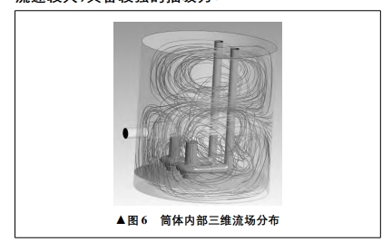 筒體內部三維流場分布如圖6所示。通過泵站在啟動狀態下筒體內部三維流線及速度矢量分布,可以看出水流從泵站進口流入后,均勻流向水泵兩側,水泵吸入口的入流未出現明顯湍流現象,水泵吸入口附近流速較大,具備較強的抽吸力。