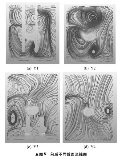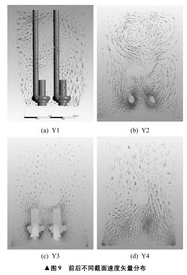 為了更仔細地觀察筒體底部流場,分別在筒體內部前后不同位置設置截面,查看流線和矢量分布。前后不同位置截面如圖7所示,從前往后依次為Y1~Y4截面。前后不同截面流線圖如圖8所示,速度矢量分布如圖9所示。