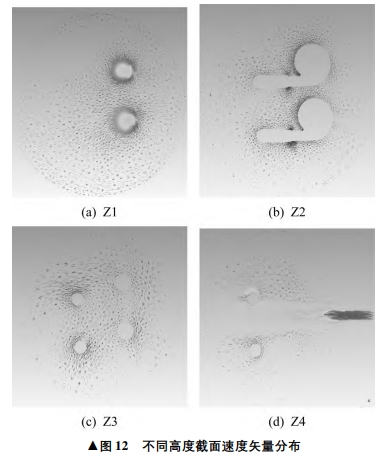筒體內不同高度截面如圖10 所示,從下往上依次為 Z1~Z4 截面。查看不同高度截面上的流線及矢量分布,不同高度截面流線圖如圖 11所示,不同高度截面速度矢量分布如圖 12 所示: