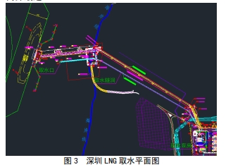 按照深圳 LNG 項(xiàng)目的總體規(guī)劃,海水取水口布置在港口碼頭棧橋的東南側(cè)海岸邊,此處地形特點(diǎn)是海岸陡峭,巖石山體下即為大鵬灣海域,水面以下海底坡度較大,在距海岸邊 170m 左右即為海域的深水區(qū)。取海水泵房布置在接收站西北角,此處距離海水出口閘門井最近。