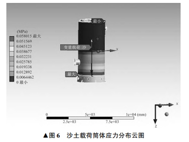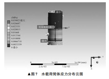 式中:ρ1 為沙土密度,取 1 900 kg / m 3 。 沙土對(duì)筒體壁面和底座底面施加載荷,筒體荷載 后的應(yīng)力分布云圖如圖 6 所示。 由圖 6 可見(jiàn),筒體外 壁面受力自上而下逐漸增大,筒體外壁面接近底座處 受到的應(yīng)力最大,為 0. 058 015 MPa。 筒體內(nèi)部有水時(shí),筒體內(nèi)部受到的壓力P2與水的深度 h2 有關(guān),為: P2 = ρ2 gh2 (2) 式中:ρ2 為水的密度,取 1 000 kg / m 3 。 筒體加水至啟泵液位,高度為 3 400 mm,水對(duì)筒 體壁面和底面施加載荷,筒體壁面荷載后的應(yīng)力分布 云圖如圖 7 所示。 由圖 7 可見(jiàn),筒體壁面受力自上而 下逐步增大,筒體壁面接近底座處受到的應(yīng)力最大,為 0. 030 023 MPa7