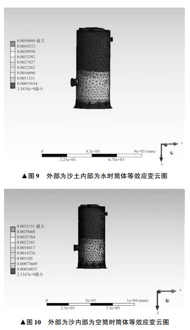 第二強(qiáng)度理論認(rèn)為材料破壞的主因是最大伸長(zhǎng)應(yīng)變,當(dāng)達(dá)到拉伸極限時(shí)材料會(huì)出現(xiàn)斷裂。簡(jiǎn)體外部為沙,內(nèi)部為水時(shí)的等效應(yīng)變?cè)茍D如圖9所示,最大等效應(yīng)變出現(xiàn)在進(jìn)口管道和底座附近區(qū)域,最大等效應(yīng)變值為0.0050089.與筒體相比變化極小,不會(huì)出現(xiàn)斷裂的危險(xiǎn)。