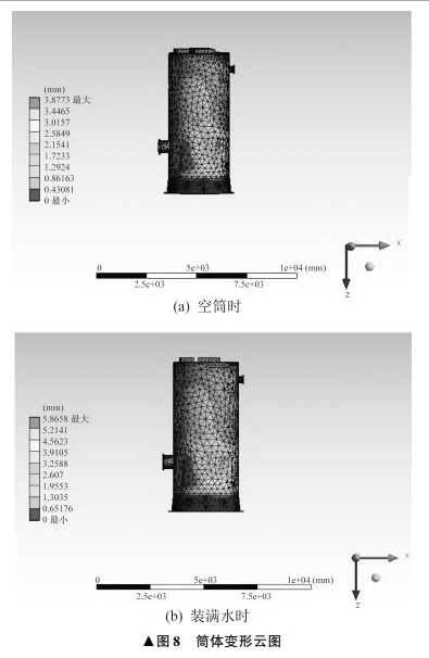 剛度指材料或結(jié)構(gòu)在受力時(shí)抵抗彈性變形的能力,是材料或結(jié)構(gòu)彈性變形難易程度的表征。材料的剛度通常用彈性模量來(lái)衡量。在宏觀彈性范圍內(nèi),剛度是零件荷載與位移成正比的比例系數(shù),即引起單位位移所需的力。剛度的倒數(shù)稱(chēng)為柔度,即單位力引起的位移。剛度可分為靜剛度和動(dòng)剛度。通常采用材料在一定受力下的變形量大小來(lái)校核材料的剛度是否滿(mǎn)足要求。簡(jiǎn)體在不同條件下的變形云圖如圖8所示當(dāng)筒體內(nèi)部為空筒時(shí),簡(jiǎn)體最大變形量為3.8733mm。當(dāng)筒體內(nèi)部為水時(shí),簡(jiǎn)體最大變形量為5.8658mm。