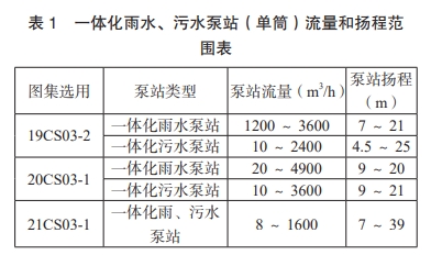 根據《19CS03-2一體化預制泵站選用與安裝(二)》《20CS03-1 一體化預制泵站選用與安裝(一)》《21CS03-3 一體化預制泵站選用與安裝(三)》“-8 三本圖集,目前可供選擇的一體化雨水、污水泵站(單簡)流量和揚程范圍如下表1。