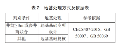 根據筒徑劃分,地基處理的方式見表2,圖集使用時的地基承載力要求、土質狀況和抗震設防要求見表3。
