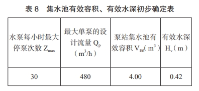《室外排水設計規范》(GB50014)中規定自動控制水泵每小時不超過6次,而對于一體化泵站中水泵因配備高啟停次數電機,目前一般最大允許啟停次數為10~30次,所引用圖集也依據此條說明。集水池有效容積及有效水深初步確定如下表 8.