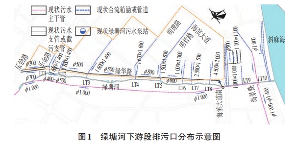 綠塘河下游段南側已建污水主管,上游接駁人民大道污水主管,沿綠塘河南側敷設,污水管管徑為1000~01 200,管道長約3.5 km,下游接駁海景路污水主干管,綠塘河南側沿線污水排口均已進行截流改造,未出現(xiàn)晴天污水溢流的現(xiàn)象。北側沿綠華路已建成污水支管,起點為樂怡路,沿線接駁樂金路、明理路明哲路等污水支管,終點于海濱大道處接入南側污水主管。因北側已建污水管網存在大量錯、混、漏接,導致現(xiàn)狀雨水管(渠)均變成合流管(渠)即使在晴天,仍有大量合流污水溢流至綠塘河,導致水體黑臭。