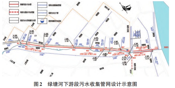 本項目治理目標為工程實施后實現(xiàn)晴天污水不入河,雨天污水少溢流,基本消除水體黑臭的考核要求。結合項目考核目標,以問題和目標為導向,通過梳理綠塘河主要污染來源,分析黑臭水體的成因,從流域綜合治理視角出發(fā),遵循“源、廠、網、河”系統(tǒng)性思維,提出控源截污、暗渠清污分流9、河道清淤、活水保質、生態(tài)修復等綜合治理措施。綜合考慮現(xiàn)狀污水收集設施、項目投資、工程可實施性等因素,在控源截污措施方面設計擬沿綠塘河北側新建污水主管,分別接入海濱大道、海景路污水主干管,沿線污水直排口接駁進污水主管,合流排污口通過設置截流井的方式收集合流污水及初期雨水,如圖2所示,