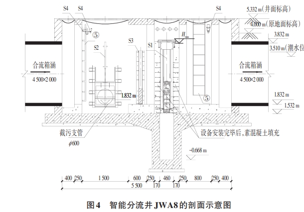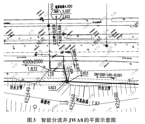 現(xiàn)以排污口LT8截流改造為例,說明智能分流井在排口改造中的應用。如圖3、圖4所示,現(xiàn)狀排水口尺寸為 BxH=4 500 mmx2 500 mm,原建設為雨水箱涵然而現(xiàn)狀卻是晴天仍可見污水排出。通過地下管線探測及排水溯源摸查,發(fā)現(xiàn)上游存在多處錯、混接的情況。受項目建設范圍、內容、資金及工期等綜合因素的限制,方案論證時建議近期完成排污口的合流制截流式改造,遠期逐步完善雨污分流改造。排污口改造措施為箱涵末端處設置下開式堰門的智能分流井JWA8,近期將箱渠內的污水截流至污水主管,待遠期完成上游雨污水錯混接改造,并結合綠塘河綜合治理措施實施后,實現(xiàn)雨天時將初期雨水截流至污水主管。JWA8下開式堰門分流井進出水管渠尺寸為4500mmX2 500 mm,井底標高維持原標高1.83m。根據其匯水面積范圍預測的污水量及截流倍數(shù)計算確定截流管管徑,管徑不宜取值過大,避免截流量遠超設計值,影響污水主管上下游污水收集,計算復核設計截流管管徑為DN600。下開式堰門的頂部標高(4.53 m)應大于河道的防洪標準的高水位標高(3.69m),減少極端天氣導致的河水倒灌現(xiàn)象。
