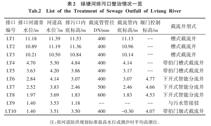 沿河排污口截流井的選擇是控源截污重要措施之一,對流域治理效果的影響至關重要。根據綠塘河下游段排污口的服務范圍、斷面尺寸、管(渠)內底標高、河涌水位、潮位影響等因素,設計截流井選擇需綜合考慮多項因素,選取合理可行的截流井形式。LT1~LT3排污口,內底標高均在歷年高潮位8.0m以上,即使在降雨且受潮位頂托時,河水倒灌的幾率極低,可選擇槽式截流井。LT4~LT5 排污口,內底標高在平均高潮位3.51m之上,在歷年高潮位8.0m以下,日常受潮位影響較小,但在降雨且受潮位頂托或天文大潮時,存在河水倒灌風險,可選擇帶拍門的槽式截流井或智能分流井LT6~LT8排污口,內底標高在平均高潮位3.51m之下,選擇槽式截流井時河水倒灌的幾率極高,尤其是 LT7、LT8排污口斷面尺寸較大,河水倒灌時,對污水主管水質水量的影響較大,容易導致上下游污水主管冒溢的現(xiàn)象可選擇智能分流井或堰式截流井,但是選擇堰式截流井在雨天時易導致上游內澇。LT9為污水直排口,應予以封堵,將污水就近接人市政污水管網。LT10內底標高在平均高潮位3.51m之下,應選擇智能分流井或堰式截流井,然而受周邊建設用地限制,只能選擇堰式截流的方式將污水收集至污水管網。因此,各排污口的截流井設計選型如表2所示。