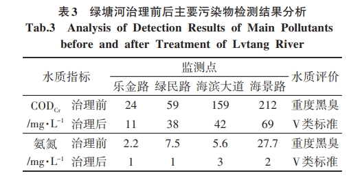 工程實施后,綠塘河下游段沿河的污水直排口實現(xiàn)晴天污水不人河,雨天污水少溢流,水體黑臭現(xiàn)象基本消除的治理目標,順利通過廣東省及生態(tài)環(huán)境部的考核評估。通過表3項目實施前后的監(jiān)測數(shù)可知,水質得到極大的改善,由重度黑臭提升至V類水標準。