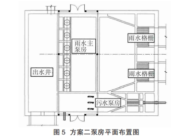 方案二。雨水泵房為雨水直進側出的矩形泵房,在雨水泵房外側設置污水截流泵房,側向出水。主泵房上部設置設備間、變配電間及控制室(見圖5)。