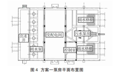 方案一。雨水泵房為雨水直進直出的矩形泵房,在雨水泵房中間設置污水截流泵房",正向出水。主泵房上部不設置設備房間,起重設備采用單梁門式起重機,僅在主泵房集水池上部設置變配電間及控制室(見圖4)。