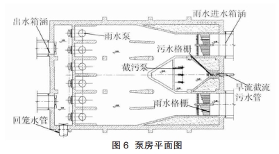 污水截流泵房設置在雨水泵房中間,在雨水格柵井、污水截流設施格柵井處設置封閉式臭氣收集罩。格柵間散發的臭氣收集后,經處理達標后排放。泵房平面圖見圖6
