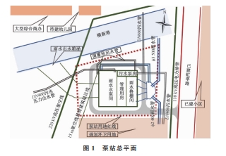 近年來,我國很多城市在雨水排水系統末端建設強排泵站時,增設初期雨水調蓄設施,將攜帶了雨天出流大部分污染負荷的初期雨水截流[1-31,于雨后利用污水管網設計充滿度以外的空余容積輸送至污水處理廠集中處理。大量初雨的排入將對中途污水提升泵站機組的穩定運行造成一定影響,對配泵選型提出要求。于此同時,隨著城市化進程的加速,市政設施建設空間受限的情況逐漸成為常態!,如何在該類情形中,對泵站進行合理布置,保證各設施和機組穩定有效運行,并與周邊環境最大程度地協調,也成為泵站設計過程中需要優化解決的問題。本文以九星雨污水合建泵站為例,討論建設空間受限情形下,排水泵站與調蓄池合建的布置方案設計,以及應對初期雨水排放進行的配泵優化,