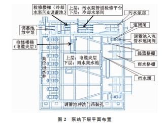 面對受限頗多的外部條件和苛刻狹小的用地空間,合建泵站在采用雨水、調蓄池上下合建,及雨、污水泵站共用地下結構和管理設施的集約化總體布置方案的前提下,還能夠通過機組選型、下部空間優化等手段,進一步精簡建筑面積、提高機組運行效率并使之與工程投資做到最大化的平衡。