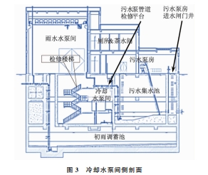 冷卻水泵間及檢修樓梯泵站利用雨水泵房北側、調蓄池頂部的地下空倉,布置干式抽芯軸流泵需配備的冷卻設施,并結合設置樓梯,一并解決電纜夾層、污水泵閥門安裝平臺、冷卻水泵間及調蓄池的日常維護及檢修需求,具體見圖 2、圖 3。