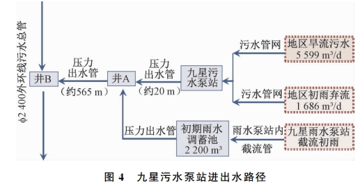 九星污水泵站平時接納九星東塊地區的旱流污水,雨天降雨結束后,除地區污水外還有地塊初期雨水棄流排入。泵站集水池內的污水經潛水泵提升后,于設于泵站內的A#井與雨水泵站下部設置的初期雨水調蓄池放空泵出水管匯合,經壓力出水管接人蘇州河六支流∅2400污水總管,壓力出水管設計管徑DN400,長度共計約585m。泵站進、出水路由示意如圖4。