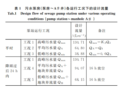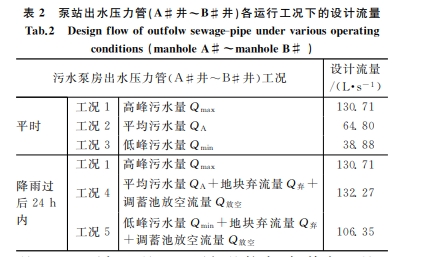 為保證控污設施的運行效果”,系統初期雨水棄流應于降雨過后24h內排空,考慮到污水泵站及下游管網設備配置及運行的穩定性,調蓄池均擬于每場降雨后按16h的放空時間錯峰排放。結合前文中所列各水量分析,污水泵房及出水壓力管在旱天及降雨過后24h內共有5種不同的運行工況,分別如表1和表2所示。污水泵房集水池水位根據《城鎮排水泵站設計標準》(DGJ08-22-2018)[8]中的相關要求,結合上位污水規劃計算得到;污水泵房出水管接入外環線總管處(井B)水位根據相關管理單位提供的資料確定。