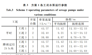 采用變頻器調節水泵運行參數,擬配3用1備共4臺同種規格的潛水離心泵。以工況1的流量作為總配泵流量,進行揚程計算,得到需配備的單泵電機功率 15 kW。對各工況下水泵的運行參數進行校核,結果如表3,可見降雨過后24h內,泵站出水壓力管內的流量差異較小,機組的平均工作揚程變化范圍在7%以內;而旱天時,泵站出水壓力管內的流量差異增大,平均及低峰流量時(工況2、3)水泵的工作揚程已偏離所配水泵的工作曲線,且對應的流量偏低。因此該方案中,為保證泵站旱天平均和低峰流量時的正常運行,有3臺水泵需加設變頻裝置,