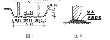 基坑完成后,需對基底找平,然后再做刃腳,以保證刃腳在同一水平面上。本雨水泵站由于土質為砂卵石,不易找平,故在對基底清理后,在刃腳下1.5m 寬度內作 2~3cm 厚水泥砂漿找平層,在其上鋪設承墊木,見圖 6所示,之后開始制作刃腳。