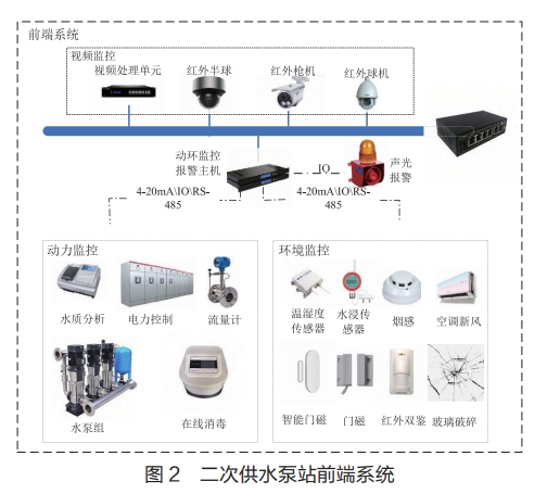 在二次供水泵站的前端系統(tǒng)中有視頻處理單元、紅外設(shè)備等監(jiān)控子系統(tǒng),水質(zhì)分析、流量計等動力監(jiān)控子系統(tǒng),各類傳感器、空調(diào)等環(huán)境監(jiān)控子系統(tǒng),門碰等門禁控制子系統(tǒng),這些子系統(tǒng)構(gòu)建為完整的前端系統(tǒng),其架構(gòu)如圖2所示。